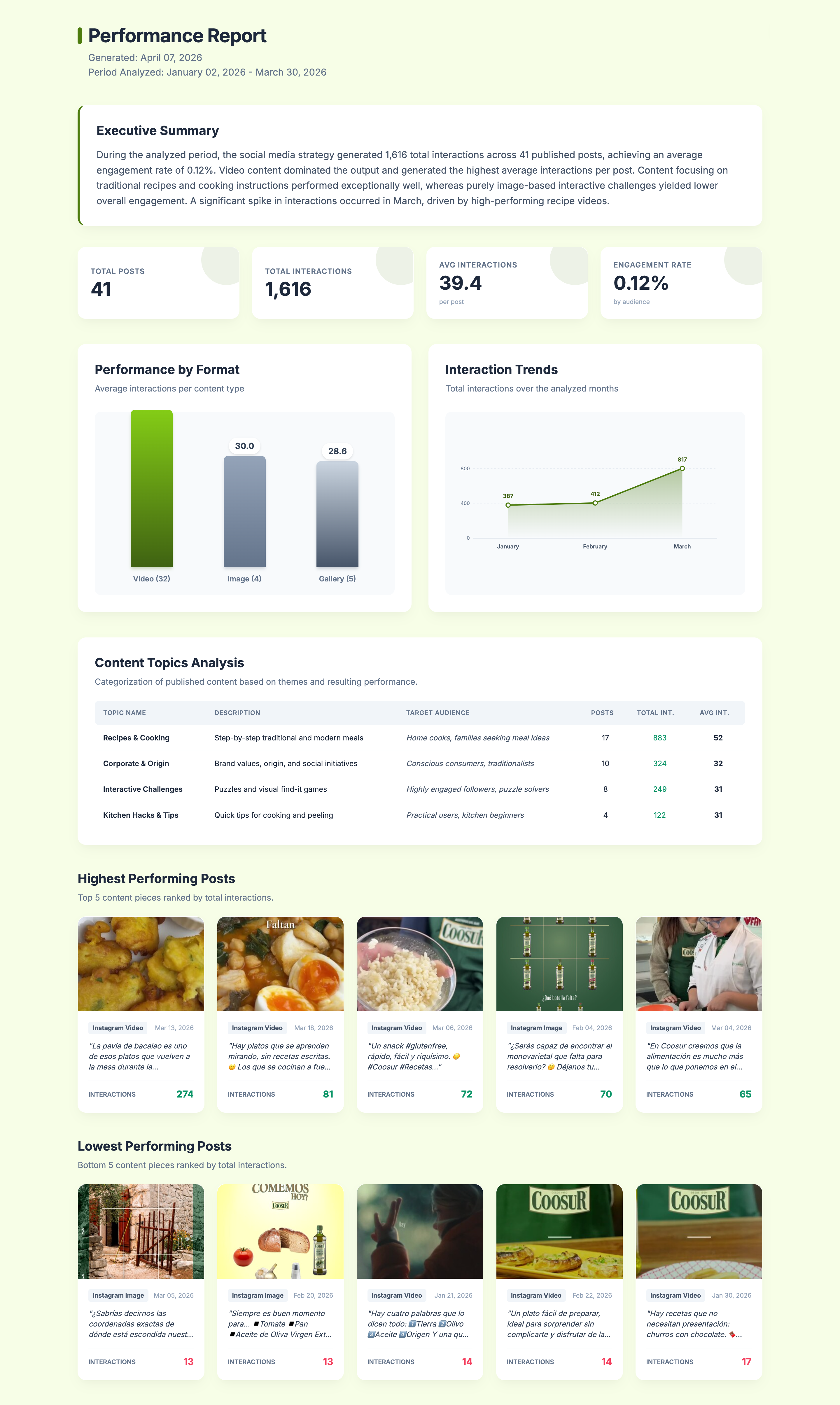 • Key metrics: total interactions, engagement rate, posts published, and average interactions per post